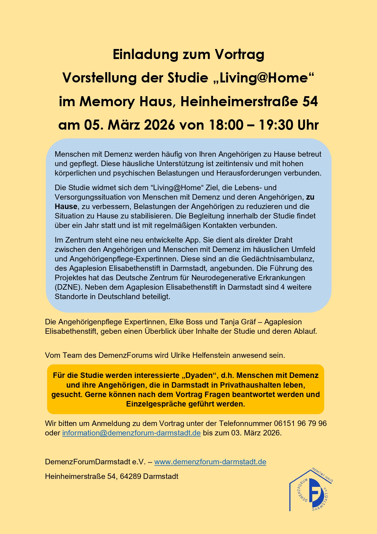 Für die Studie werden noch Menschen mit Demenz und ihre Angehörigen gesucht. Der Vortrag findet am 05.03.2026 von 18:00 - 19:30 Uhr statt. Weitere Infos hierzu finden Sie im angehängten Flyer.