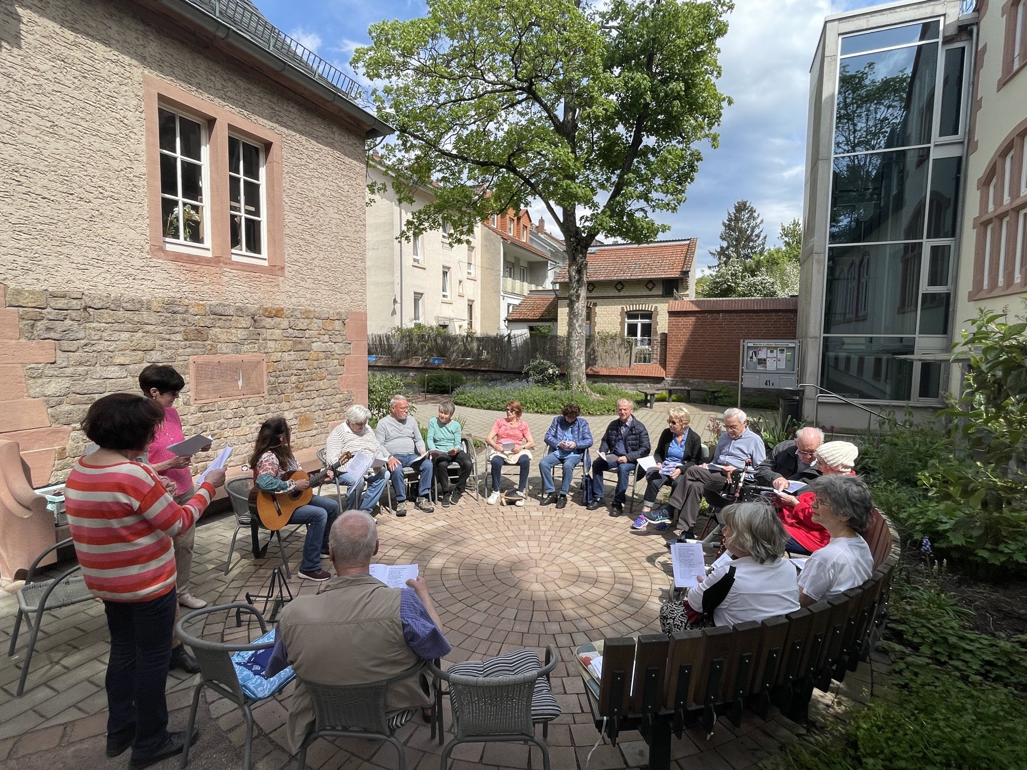 „Sing mit – Mit Musik geht alles besser!“ hieß es wieder einmal am 05.05.23. Zu der beliebten Veranstaltung kamen auch einige neue Gesichter. Dieses Mal hatten wir uns für einen Platz mit festen Sitzbänken zwischen der Kirche und dem Gemeindehaus entschieden. Das erwies sich als gute Entscheidung. Ergänzt um einige Stühle konnte ein großer Kreis gebildet werden, in dem alle gleich gut Angela Brantzen mit ihrer Gitarre sehen konnten. Da sich zwischen den Gebäuden der Schall auch besser fängt als im offenen Garten, war die Akustik abseits der Straße ebenfalls besser.