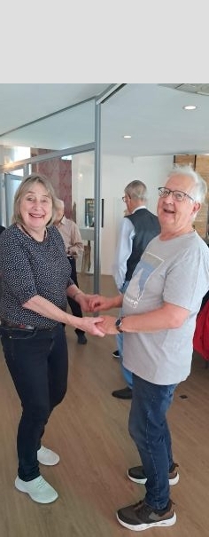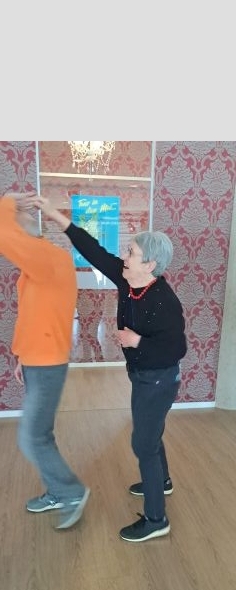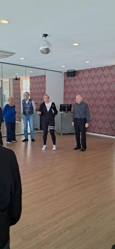 Sogleich lud sie alle Teilnehmer zu einer stehenden Runde auf das Tanzparkett ein. Es wurden die ersten Schritte ausprobiert, anschließend mit Musik untermalt und schon kam Bewegung in die Gruppe. Nach und nach kamen einige Schritte hinzu und innerhalb von 15 Minuten legten alle fröhlich einen Twist auf das Parkett.