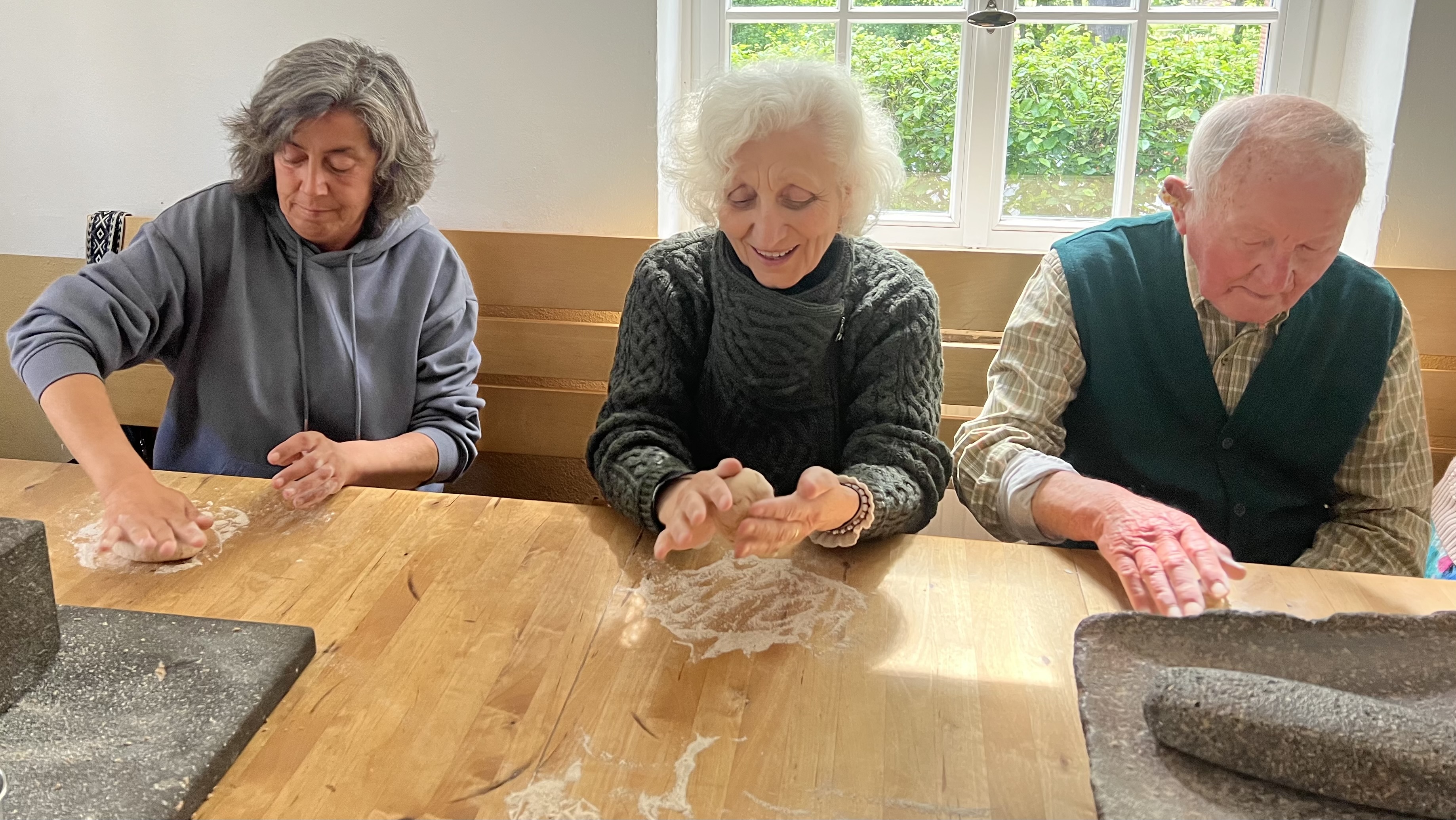 Anschließend kamen die Teilnehmer am langen Tisch im Schulungsraum zusammen, um selbst Hand anzulegen und verschiedene Mühlen und Mahltechniken zu erproben. Da wurde mit großem Eifer das Korn auf Mahlsteinen zerrieben, gemörsert oder durch die Handmühle gedreht und auch fein durchgesiebt. Es entstand ein reger Austausch zwischen den Teilnehmern. Dabei kamen viele Kindheitserinnerungen auf. Sehr eindrucksvoll war die Erfahrung wie mühsam manche Technik sein kann. In der Zwischenzeit hatte Mira einen Hefeteig angesetzt. Jeder Gast bekam einen Teigling in die Hand um zu kneten und ein Brötchen daraus zu formen. Der Kreativität waren keine Grenzen gesetzt. Das Ergebnis war sehr individuell z. B. spitz, länglich, rund, mit Rillen, Dellen oder Körnern obendrauf. Auf dem Backblech war das eigene Gebäck dadurch leicht wiederzuerkennen.