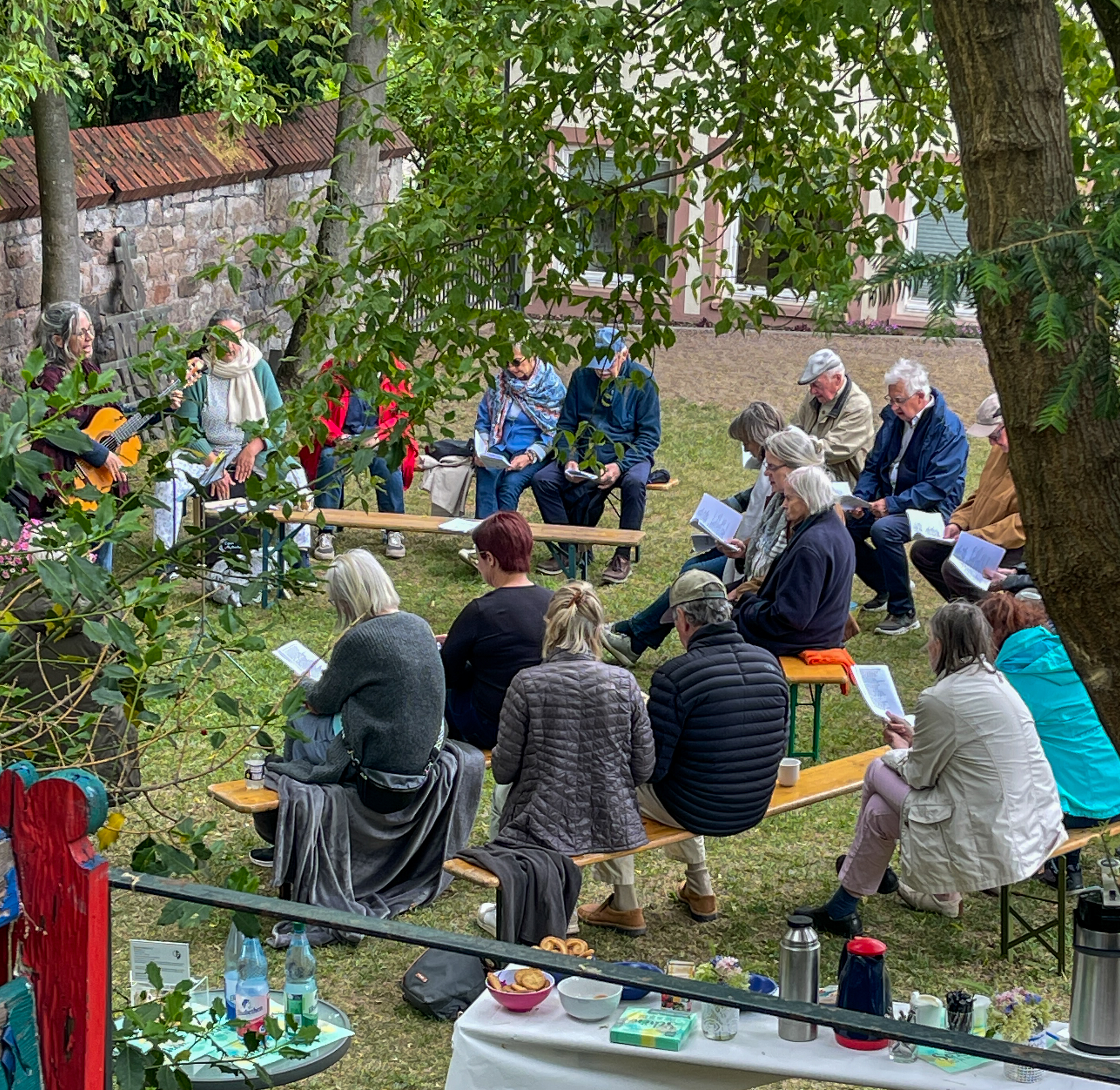 Der Wonnemonat verwöhnte die Menschen mit einem grünen Blätterdach und bunt leuchtenden Blumen, allerdings hielt er sich an diesem Tag mit den Temperaturen etwas zurück. Es war zuweilen sonnig, aber insgesamt waren die Teilnehmenden klug genug, sich mit wärmeren Jacken ausgestattet zum Singen einzufinden. So konnte sich jede Teilnehmerin und jeder Teilnehmer den wechselnden Bedingungen rasch anpassen.
