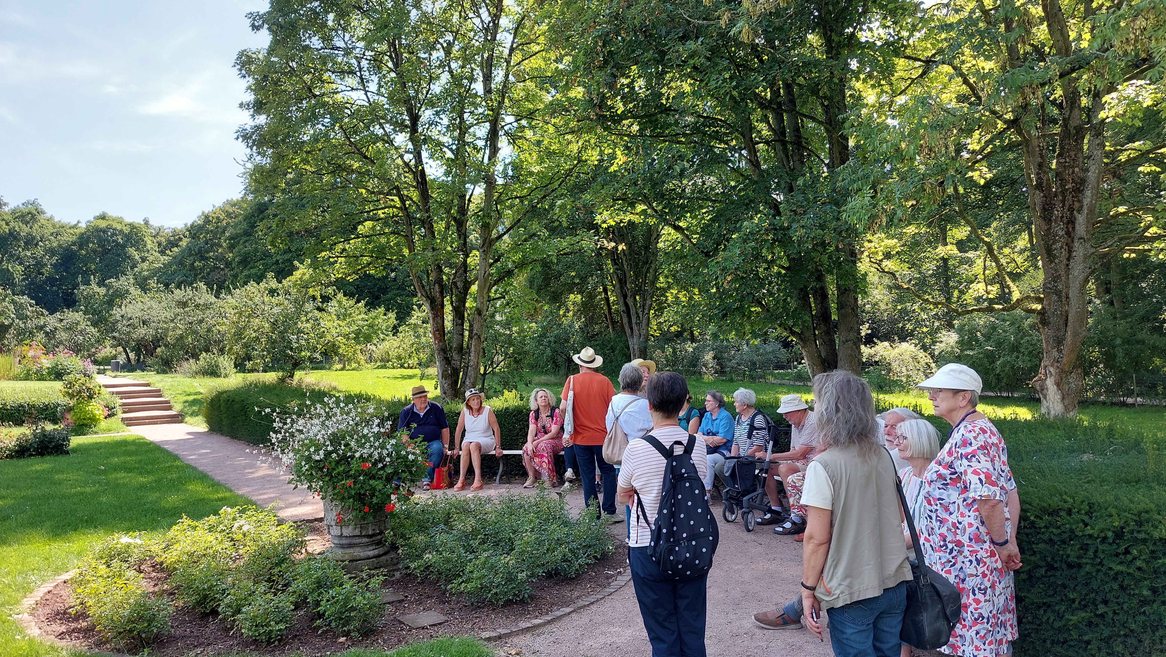 So ging es weiter hinauf zu den Rosenbeeten mit Blick auf den Rosendom, wo wir im Schatten unsere letzte Rast machten. Nach gut eineinhalb spannenden Stunden und einer kurzen Trinkpause ging es zurück durch den sommerlichen Park zum gigantischen Eingangsportal. „Das war ein interessanter Rundgang!“ bestätigten selbst diejenigen, die den Park schon lange kennen.