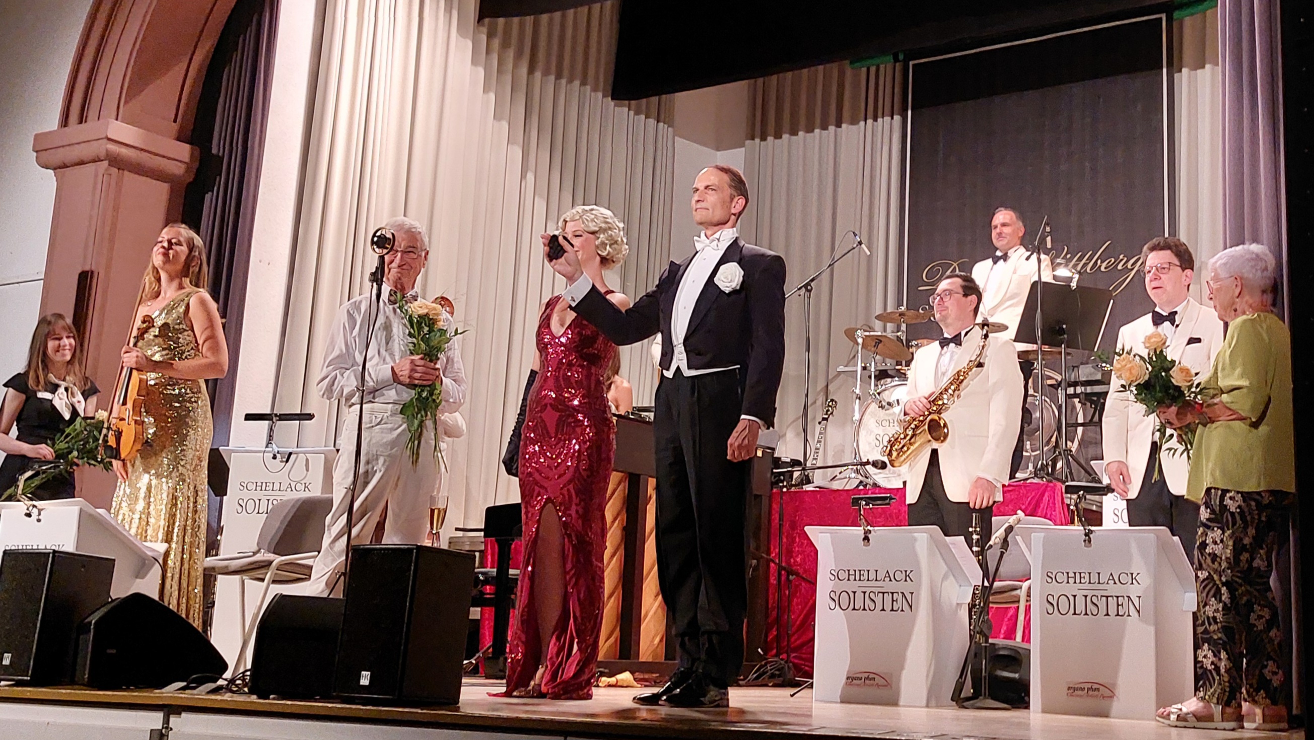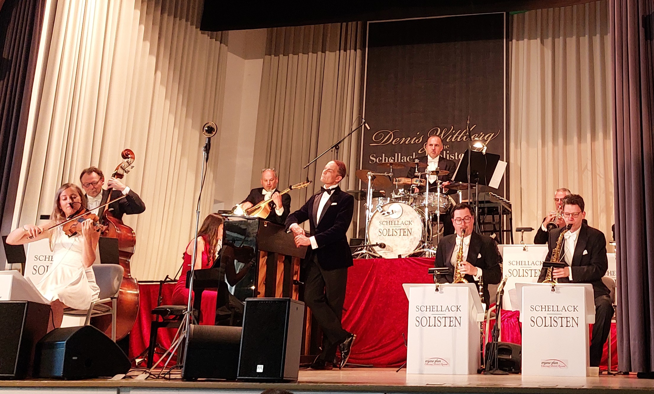 Auf der Bühne breiteten Denis Wittberg & seine Schellack Solisten sogleich die Atmosphäre der 30er Jahre des letzten Jahrhunderts aus. In Frack und Fliege am „alten“ Mikrophon stehend leitete er von einem alten Schlager zum nächsten. Alles irgendwie vertraute, alte Ohrwürmer aus berühmten Filmen jener Zeit, in der man Musik zuweilen noch auf dem Grammophon zu Gehör brachte. Natürlich ging es um die Liebe, um Sehnsucht und ums Träumen. Und wie lassen sich Gefühle besser ausdrücken als in der Musik. Ob nun „Ich tanze mit dir in den Himmel hinein“ oder „Ich bin von Kopf bis Fuß auf Liebe eingestellt“ oder „Wenn der weiße Flieder wieder blüht“, die Herzen des Publikums waren augenblicklich erobert!