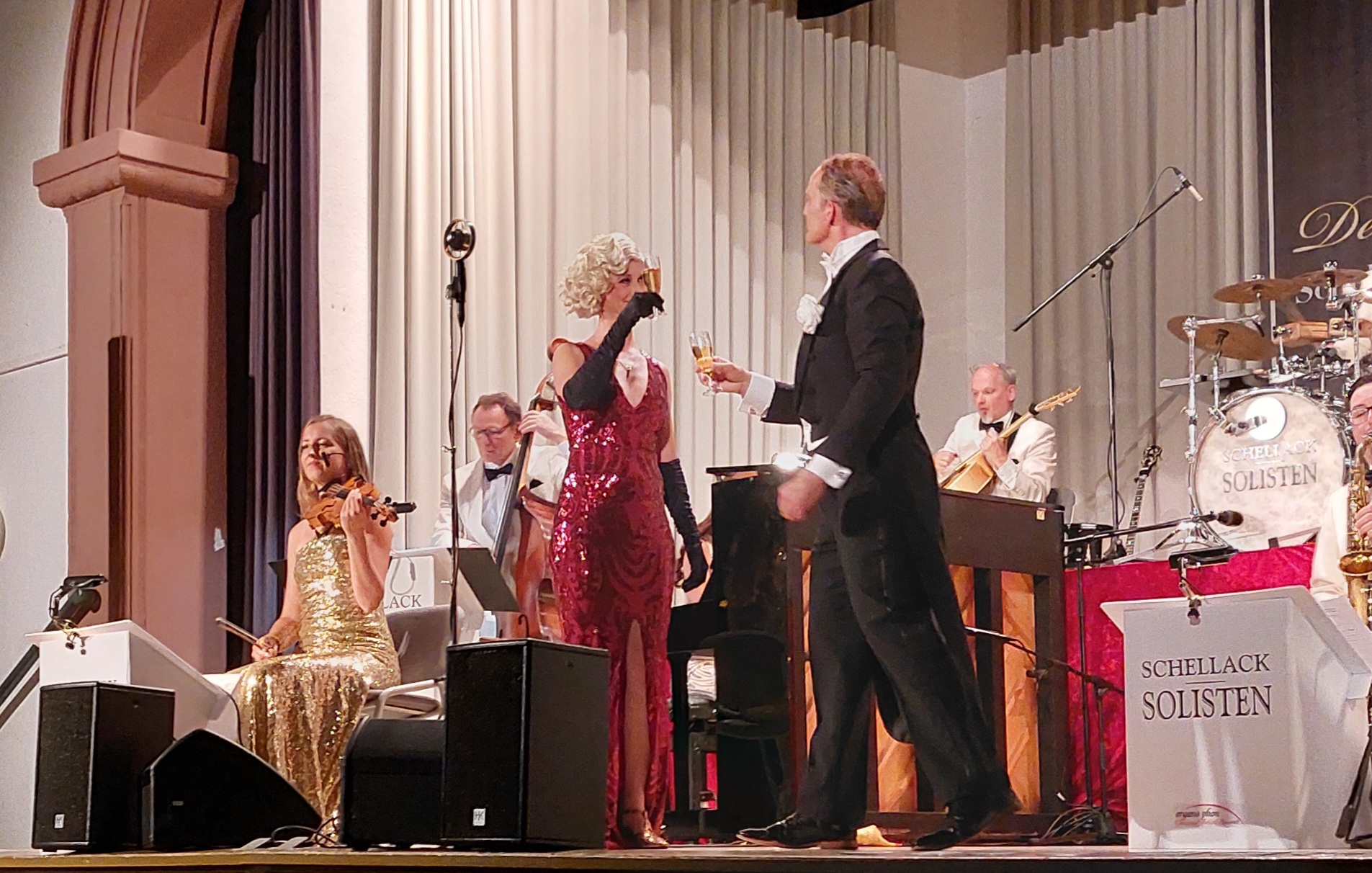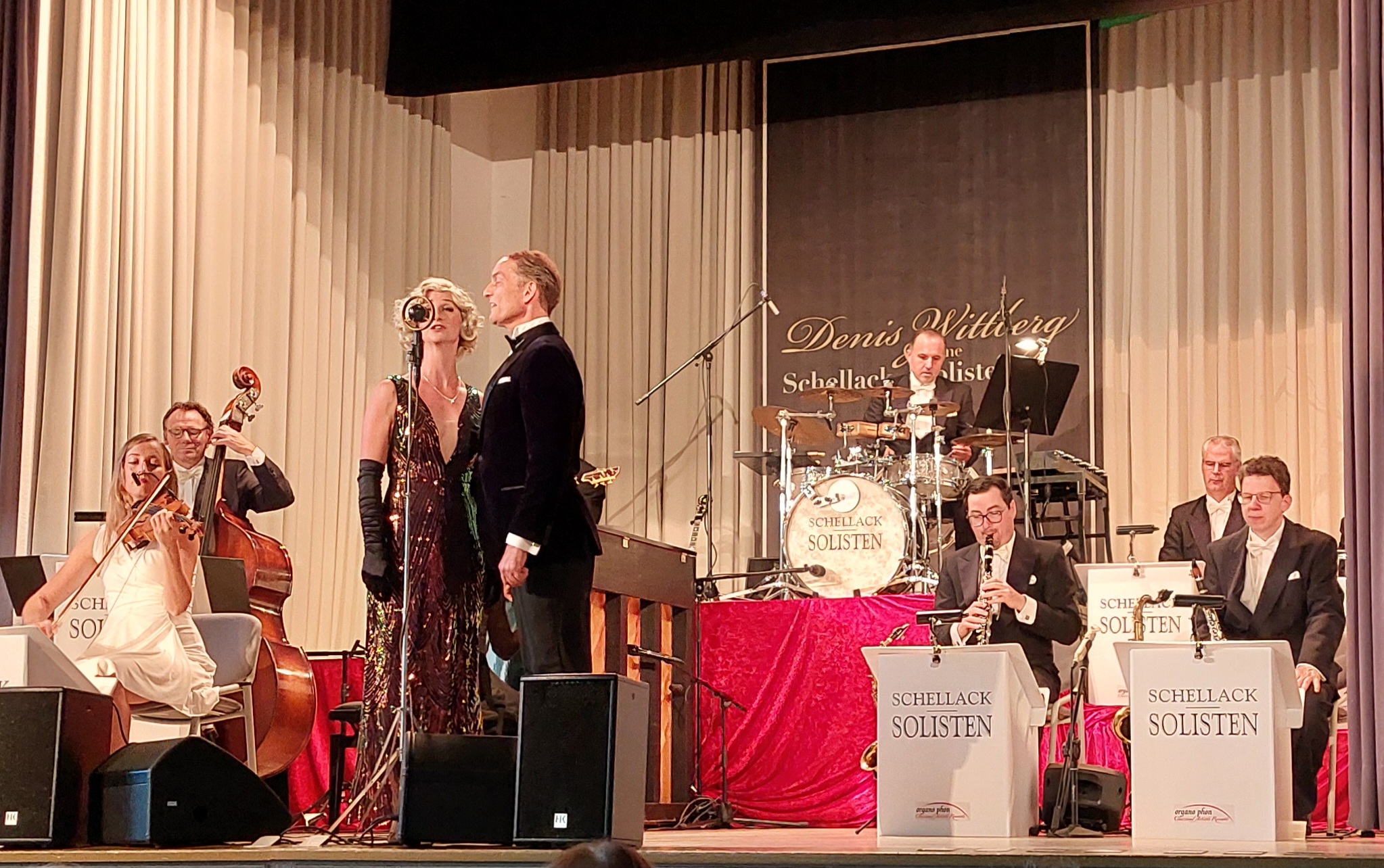 Dann trat noch die Sängerin und Schauspielerin Susanne Anders an die Seite von Denis Wittberg. Gemeinsam oder im Wechsel allein trug auch sie das eine oder andere Lied vor. Mal im elegant glitzerndem Abendkleid, mal mit Frack und Hut. Auch für ein kurzes Tänzchen des schönen Paares gab es kurz Raum. Für das Publikum verging die Zeit wie im Fluge. Mit großem Applaus wurden den Musikern drei Zugaben entlockt. Zu dem 80er Jahre Schlager „Sternenhimmel“ von Hubert Kemmel, das im Stil der 30er Jahre interpretiert wurde, als stammte es aus der alten Zeit, gesellte sich der lustige Titel „Mein kleiner, grüner Kaktus“ und schließlich „Schlafen geht das kleine Saxophon“.