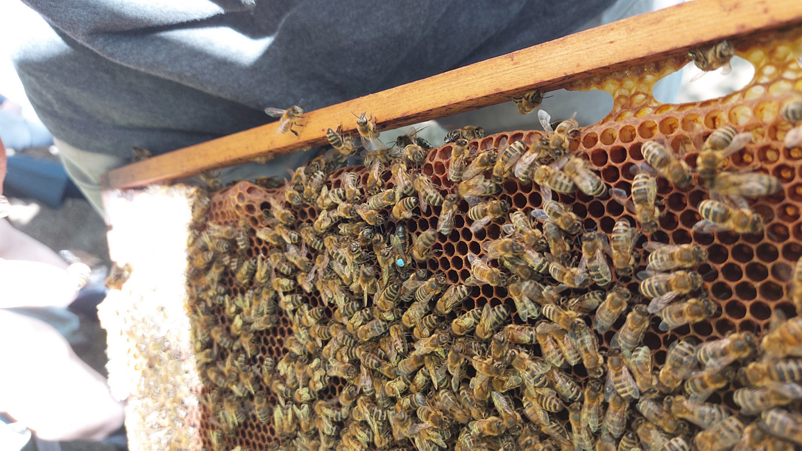 Im Garten angekommen zeigte uns Herr Fuchs, wie sich die Bienen für ihre Arbeit organisieren, wie sie ihre Brut ernähren, sich fortpflanzen und auch, wie sie sich untereinander verständigen, wenn sie die besten Futterplätze anfliegen wollen. Dabei verfügen sie über bemerkenswerte Fähigkeiten, je nach Tageszeit, Sonnenstand, Ausrichtung und Entfernung der Ernteplätze diese Informationen in Form eines Tanzes nachfolgenden Arbeiterinnen mitzuteilen. Auch wie sie ihre Stöcke vor Eindringlingen und fremden Krankheitserregern schützen, war sehr aufschlussreich.