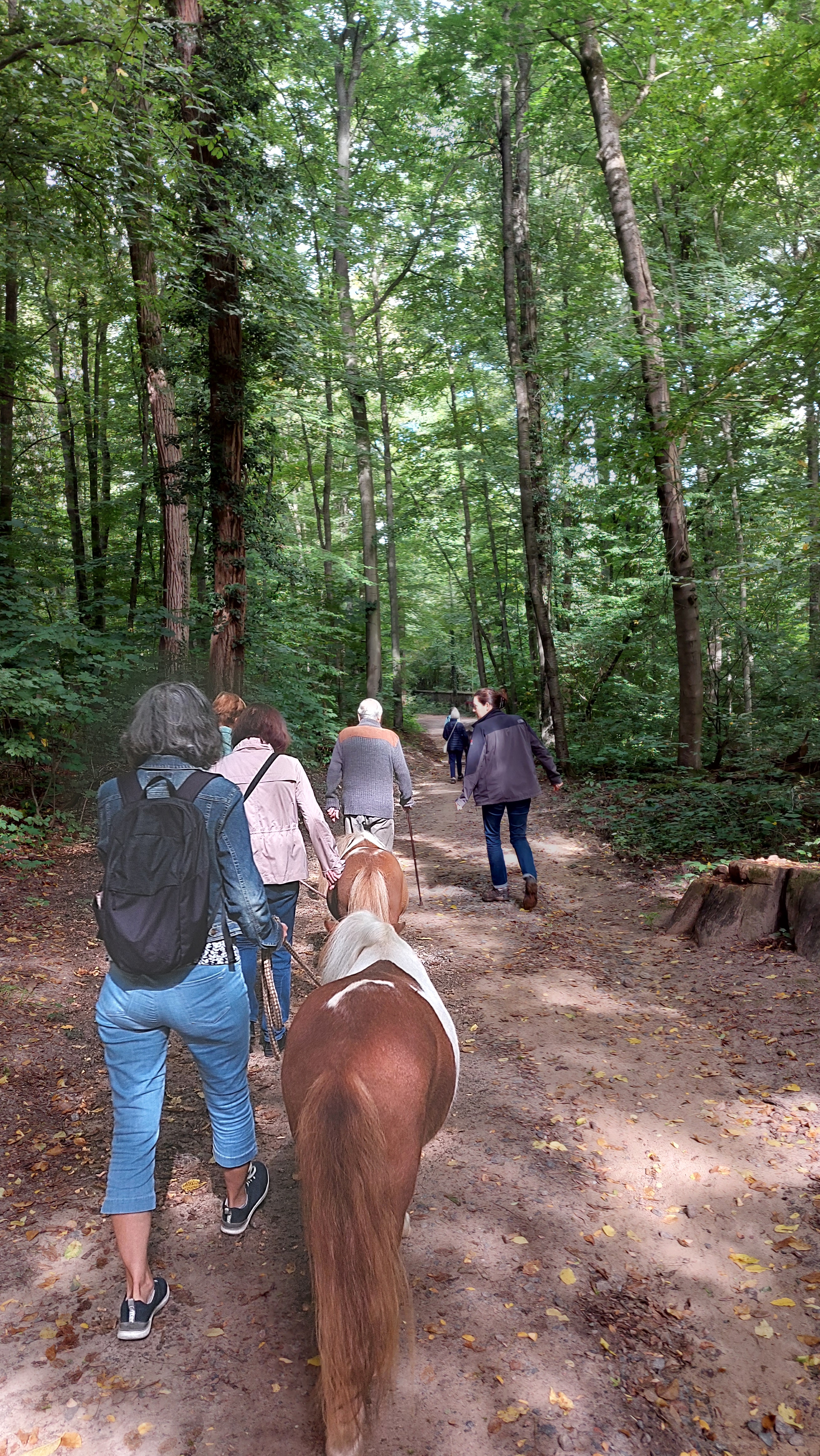 So fanden sich am 05. September alle Teilnehmenden an der Haltestelle Oberwaldhaus ein und spazierten zum früheren „Alten Forsthaus“ aus dem Jahr 1886. Wir wurden von Katharina Hübner auf dem Bauernhof neben dem Forsthaus begrüßt. Zunächst erzählte Frau Hübner von der Entwicklung des Hofes, auf dem sehr viele Ponys zusammenleben, aber auch Hühner und ein paar Ziegen zur Tiergesellschaft gehören. Wir erfuhren auch einiges über das tierische Miteinander, das menschlichen Gemeinschaften manchmal recht ähnlich sein kann. Dabei hat jedes Pony seine Eigenheiten, die es nicht nur in der großen Gruppe auf der Koppel am Hof sondern auch beim Spaziergang zu verstehen gilt, um den Charakter und die Bedürfnisse des Tieres zu respektieren. Und dann ging es auch schon los. Mit drei Ponys am Halfter zog unsere Gesellschaft los in den angrenzenden Wald.