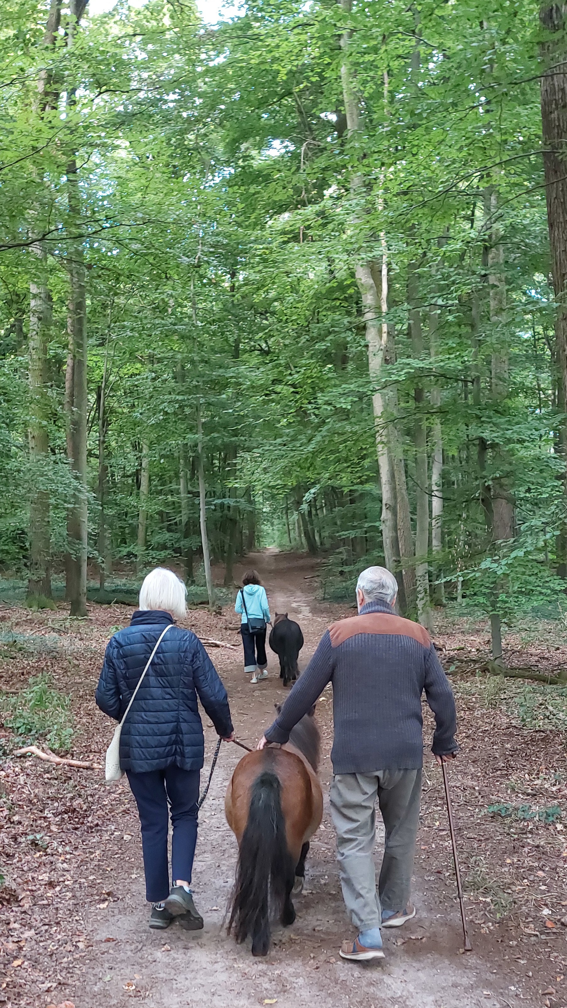 Wir streiften durch den Wald und die Teilnehmenden wechselten sich beim Pony-führen ab. Selbst die anfänglich eher zurückhaltenden Menschen gewannen rasch Zutrauen mit dem Vierbeiner am Halfter. Auf dem Rückweg kamen wir noch an einer kleinen Wiese vorbei, wo alle Ponys unbedingt nochmal stehenbleiben und etwas naschen mussten. Am Hof wurden wir von den Ziegen begrüßt und später auch zum Ausgang begleitet. Dabei stellte sich ein Böckchen so auf, dass es die gesamte Szenerie gut „überwachen“ konnte. „Das war ein schöner Vormittag.“ war am Ende die einhellige Meinung der Teilnehmer.