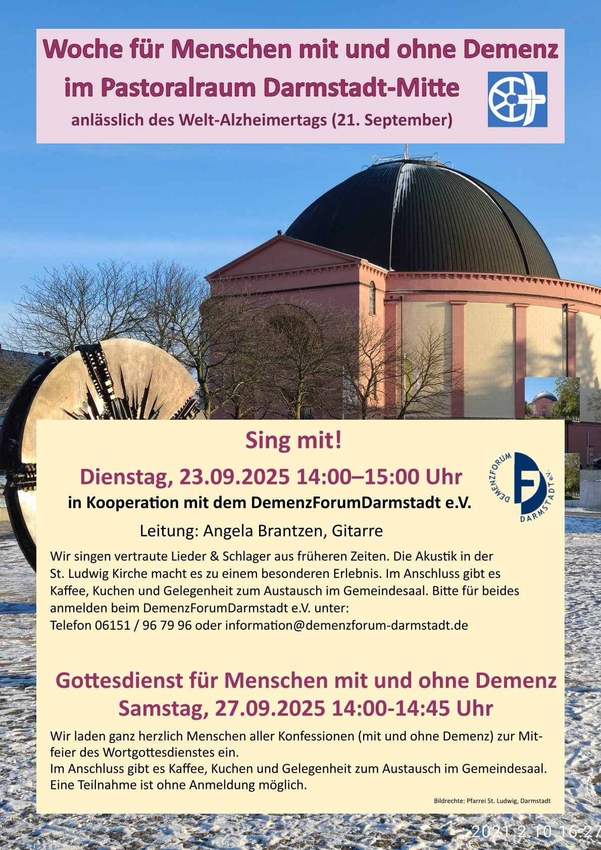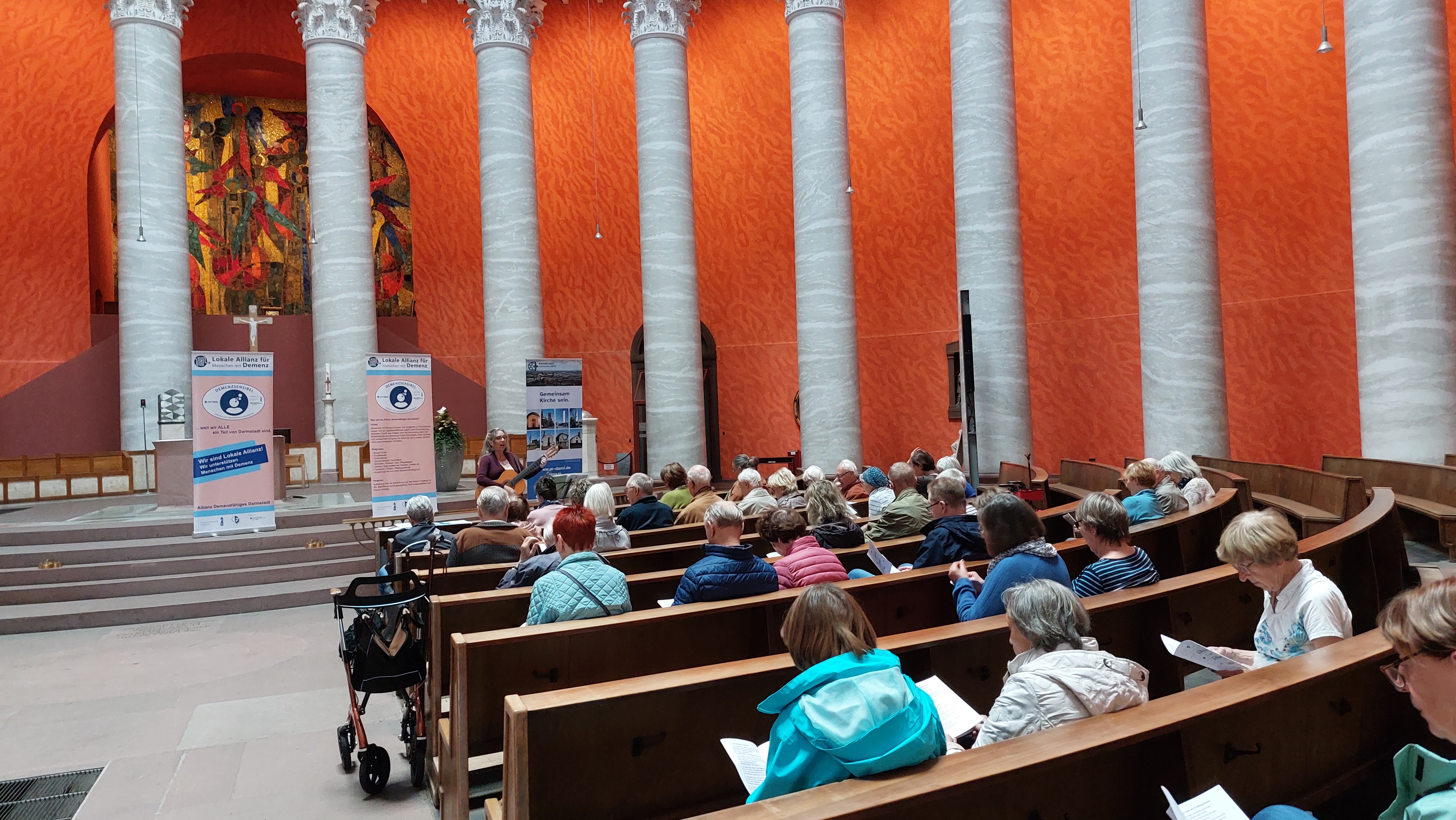 Schon vor den Zugängen zur Kirche machten große Plakate auf die bevorstehenden Veranstaltungen während der Welt-Alzheimer-Woche aufmerksam: eine davon die gemeinsame Singveranstaltung für Menschen mit und ohne Demenz, organisiert vom Demenzforum Darmstadt. In der Mitte der Kirche machten große Fahnen auf den Anlass der Veranstaltung aufmerksam, in der Nähe des Eingangs lagen zahlreiche Informationsblätter rund um das Thema aus. Viele Teilnehmende hatten sich dafür bereits vorher beim DFD angemeldet. Nun kamen sie in die Kuppelkirche und nahmen in den halbrunden Bankreihen um den zentralen Punkt in der Kirche Platz.