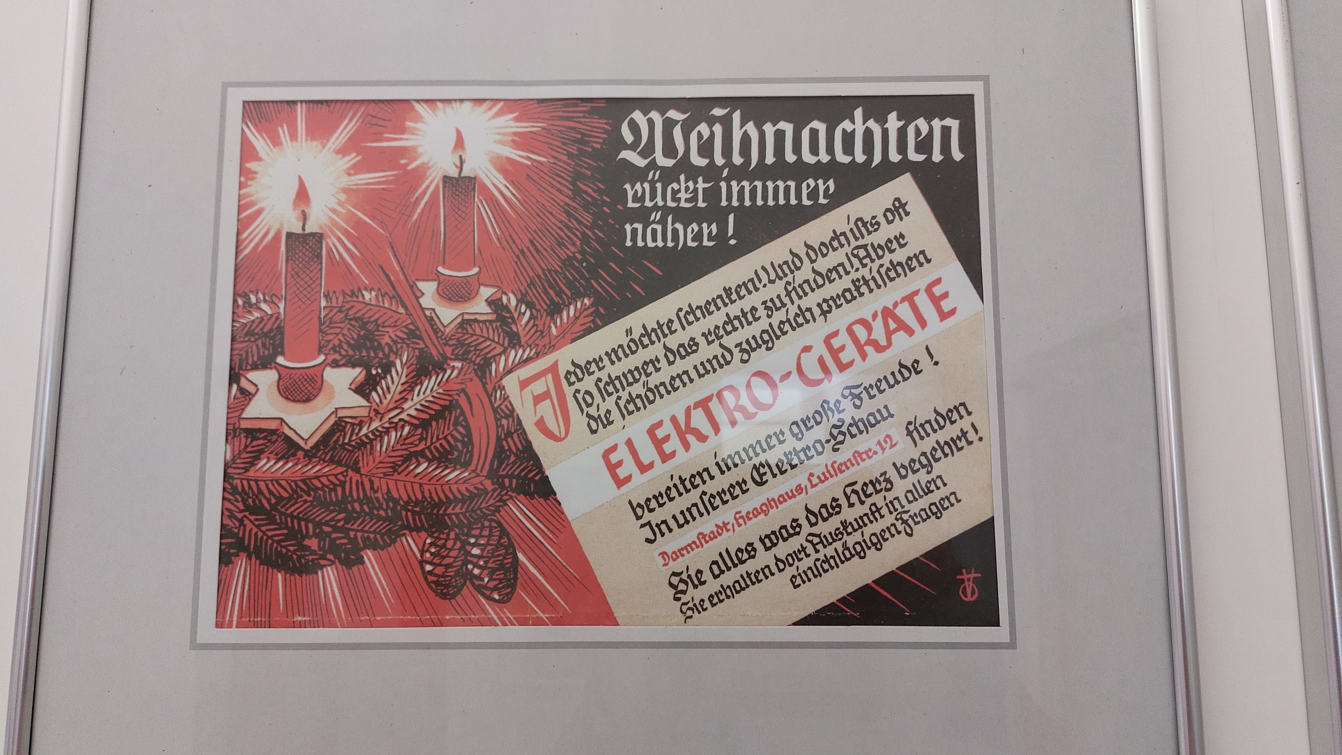 Die Räume sind so gestaltet, dass ihnen verschiedene Viertel der Stadt zugeordnet sind. Passend dazu finden sich auf dem Boden der Räume die zugehörigen Straßennamen und sie sind in verschiedene Farben gehüllt. Die Führung begann mit Bildern zum Thema "Die südhessische Natur als zweites Italien". Hier gab es nicht nur Naturansichten im Stil der Romantik zu bewundern, sondern auch eine Fotocollage der Body-Art-Künstlerin Annegret Soltau mit Darstellungen ihres Körpers im Felsenmeer. Dann ging es weiter über die sonnengelb leuchtende Rosenhöhe und durch verschiedene Stadtteile wie Bessungen, das Woogsviertel und Kranichstein. Beeindruckende Gemälde Darmstädter Künstler mit historischen Stadtansichten gaben Gelegenheit, die damaligen Eindrücke mit heutigen Gegebenheiten zu vergleichen. Doch nicht nur Gemälde gab es zu bewundern. Vielmehr erhielten wir z.B. auch Informationen zur Geschichte der Internationalen Tage für Neue Musik, die 1946 in Kranichstein ins Leben gerufen wurden. Zur Veranschaulichung wurde ein kurzer Auszug aus einer dabei entstandenen Komposition vorgespielt. Vertiefende Erläuterungen gab es dann u.a. noch zu einer der typischen Vogelplastiken des Bildhauers Gotthelf Schlotter und zu dem auch heute noch bekannten Künstlerhaus Ziegelhütte.