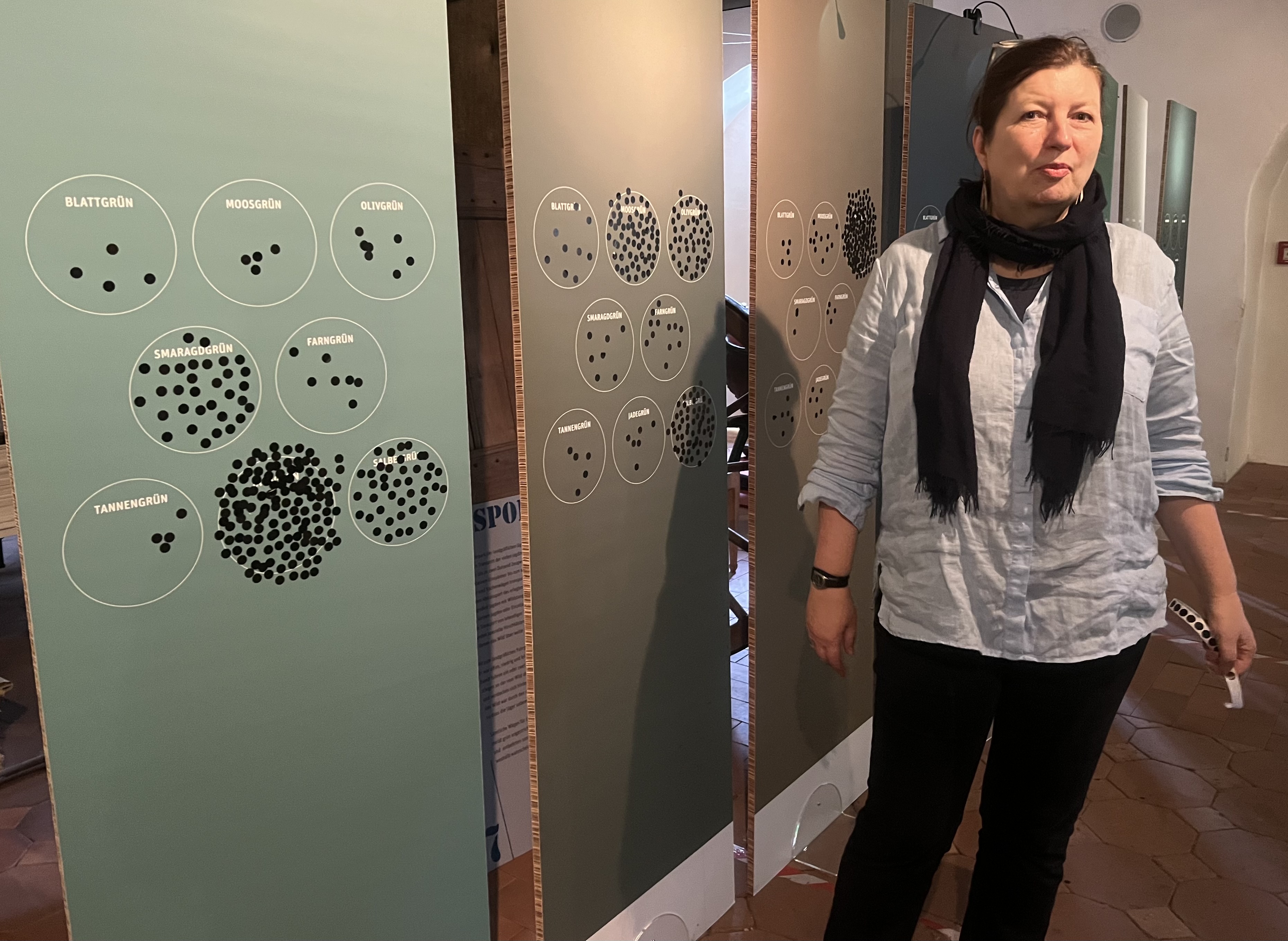 Dabei wurden die Gäste gleich beim Start aktiv einbezogen und zum Mitmachen animiert. Auf einer Tafel waren verschiedene Grüntöne zu sehen. Die Teilnehmer sollten die dazu passende Bezeichnung auswählen z. B. Moos-, Smaragd-, Blatt- oder Tannengrün. Dann durfte jeder Teilnehmer mit einem Klebepunkt den Begriff, der seiner Meinung nach am besten zu jeweiligen Farbe passte, markieren. Einige Farbtöne wurden sofort und von der Gruppe eindeutig zugeordnet. Bei anderen fiel es schwerer sich auf eine Bezeichnung festzulegen, so dass sich innerhalb der Gruppe lebhafte Diskussionen ergaben.