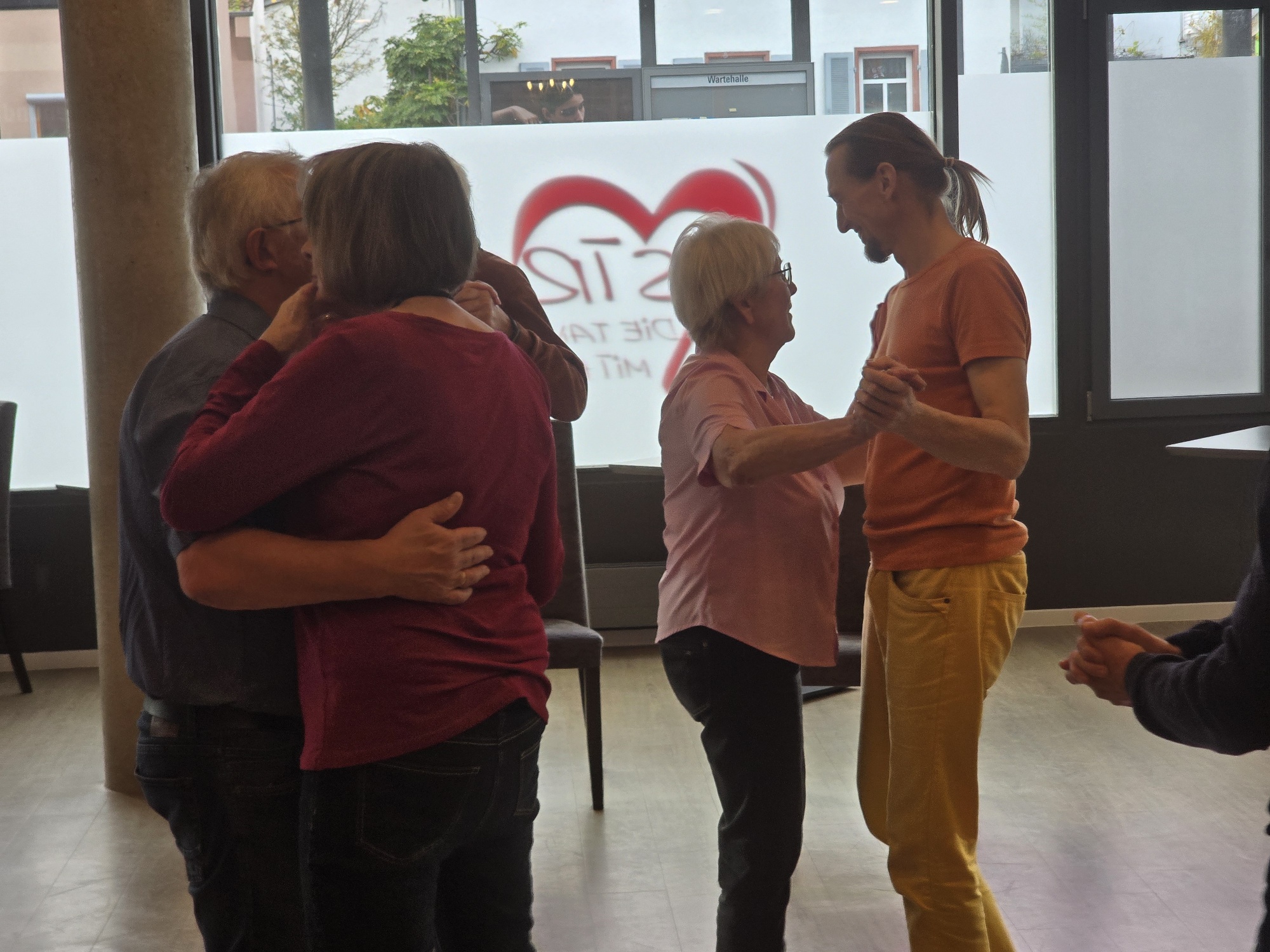 Ein heller Empfang: Katja begrüßt die Gäste mit einem Handschlag „Schön, dass du da bist!“ Erinnerungen an eigene alte Tanzschultage werden wach und bald weggeschoben. Im Empfangsraum finden sich schon einige Teilnehmende ein. Ein Paar hat 50 Jahre alte Fotos von ihrer ersten Tanzschulzeit bei der Tanzschule Stroh dabei. Die Tanzlehrerin ist begeistert. Langsam trudeln weitere Gäste ein. Die Musik spielt im Hintergrund…