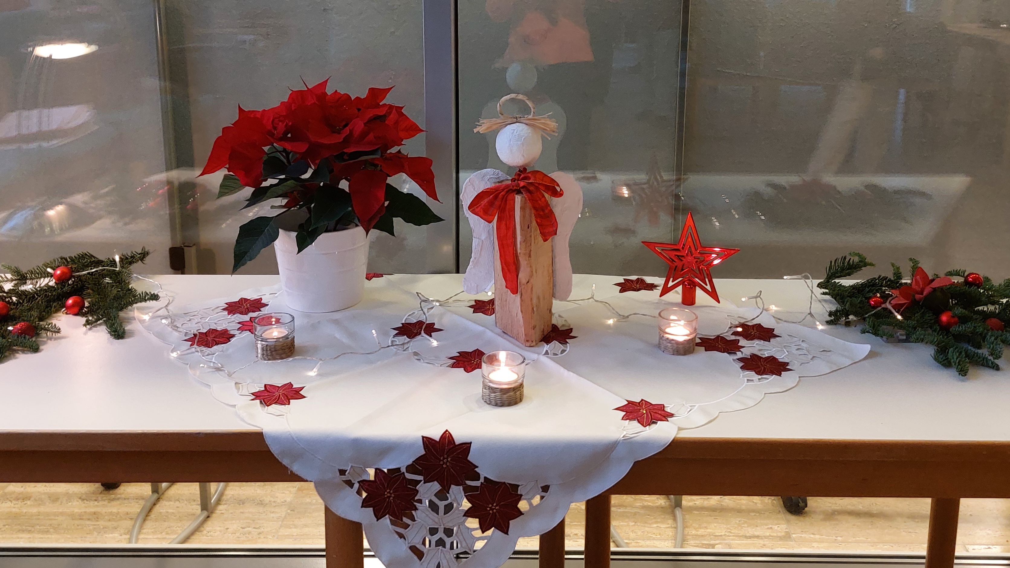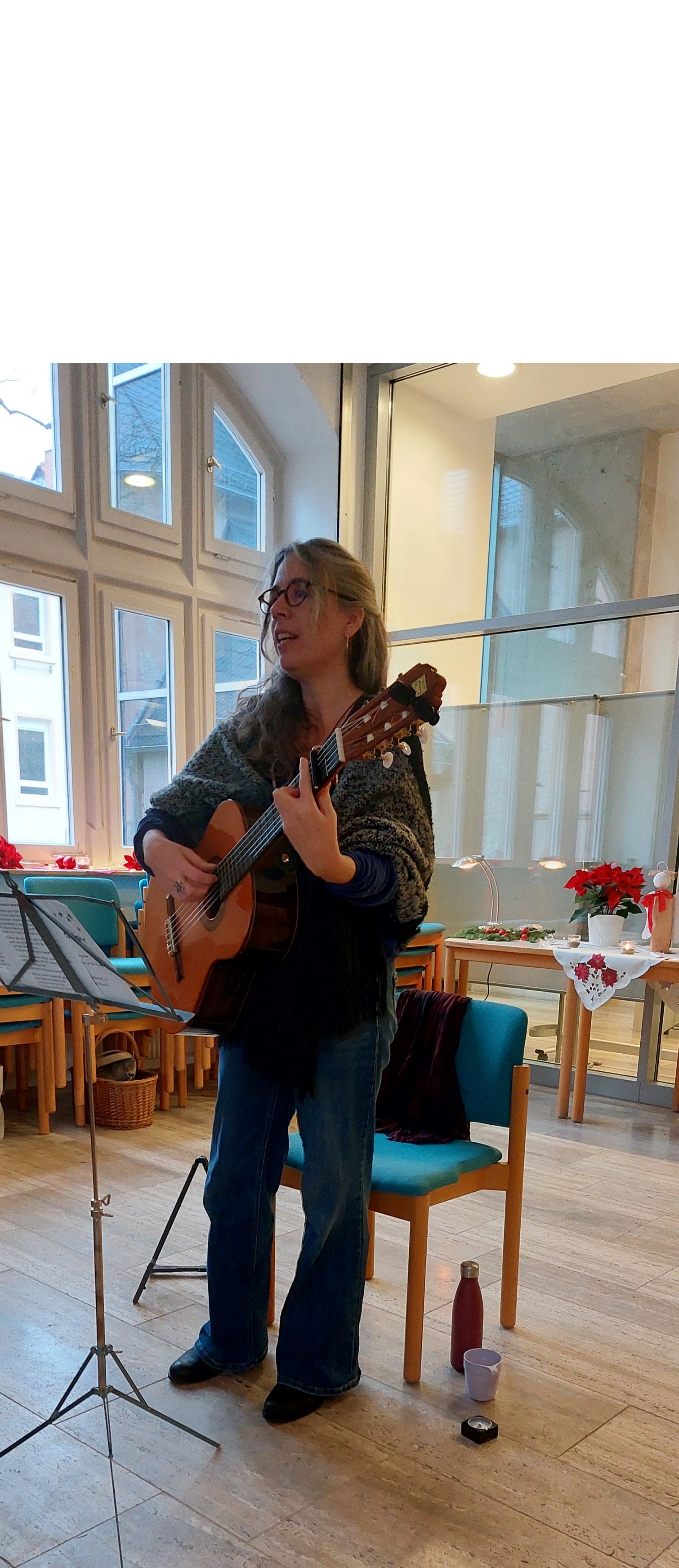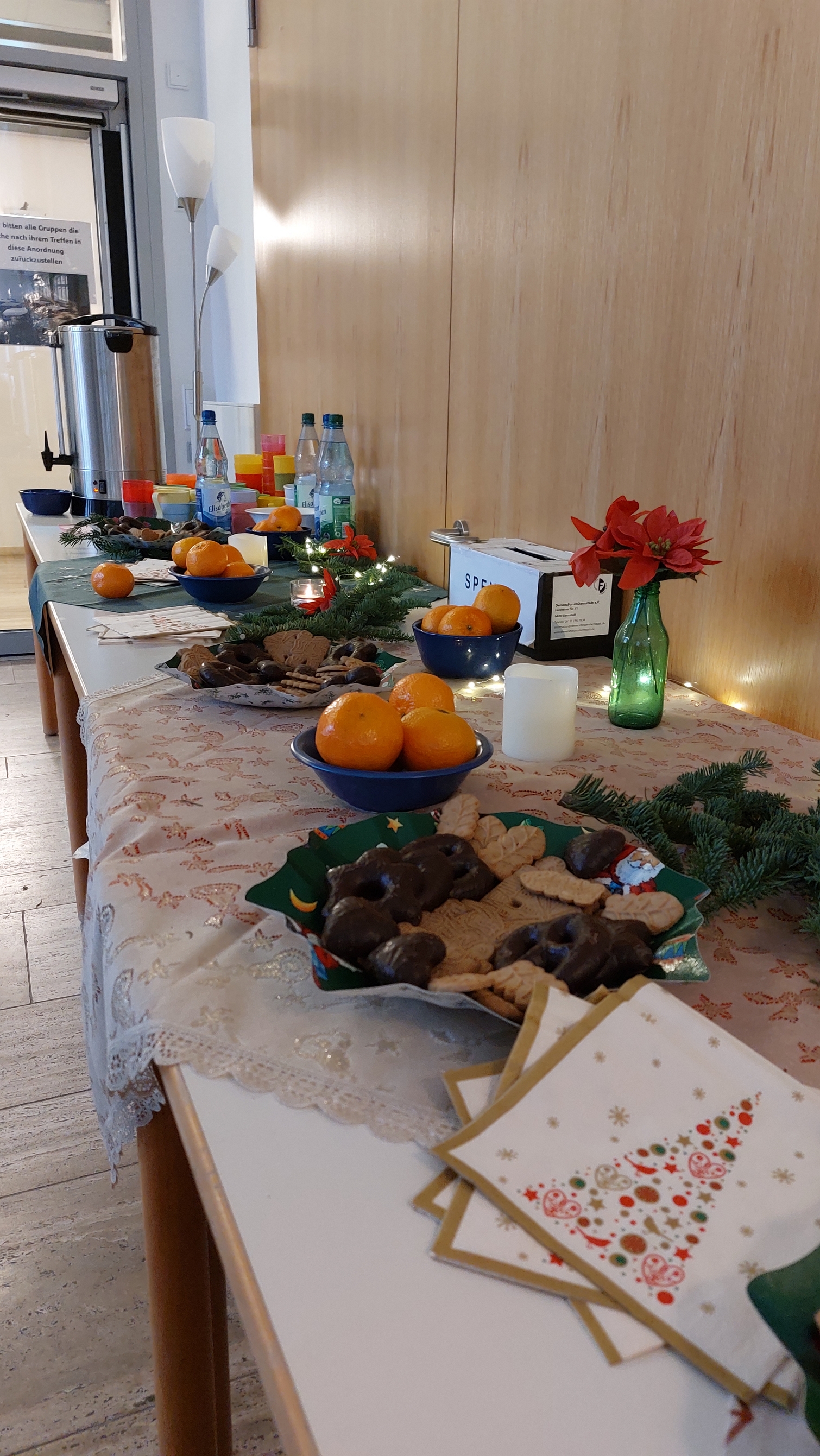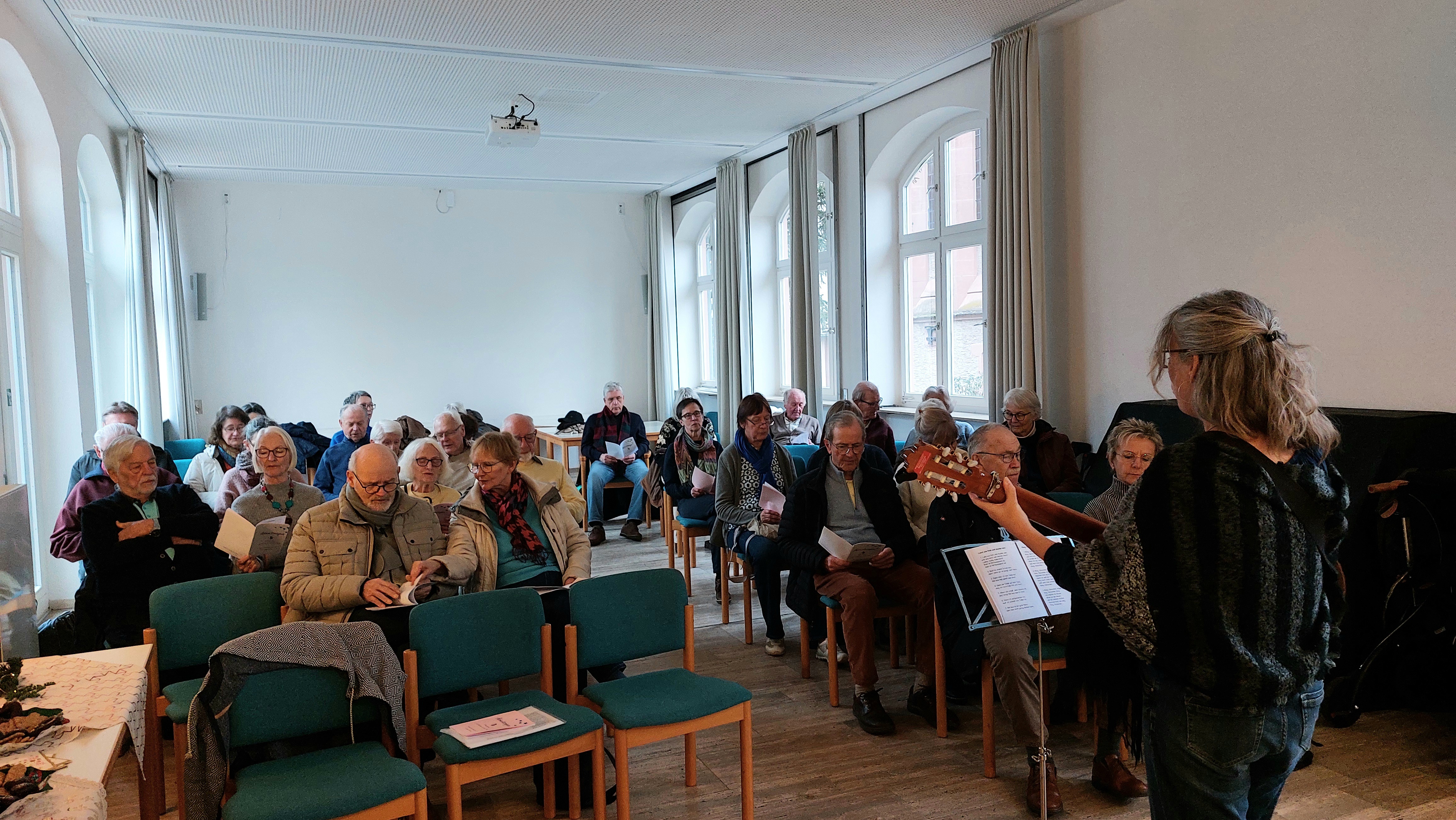 Weil sie einen sehr schönen, stimmungsvollen Rahmen bildet, war unsere letzte Sing Mit! Veranstaltung wie in den vergangenen Jahren in der Martin-Luther-Kirche geplant. Allerdings kamen dann doch Bedenken auf, nachdem es im letzten Jahr so arg kalt gewesen und die Singleitung danach erkrankt war. Dank der Unterstützung der Pfarrerin konnte die Veranstaltung kurzfristig in den großen Saal des Gemeindehauses verlegt werden. Die ehrenamtlichen Helferinnen haben den recht nüchternen Raum mit großer Liebe und Phantasie rasch in ein gemütliches Ambiente verwandelt, zahlreiche Kerzen, Lichterketten, Tannenzweige und Weihnachtsdecken auf den Tischen ausgebreitet, Teller und Schalen mit Knabbereien und Clementinen aufgestellt. Daneben köchelte leise der Früchtepunsch und verteilte seinen weihnachtlichen Duft. Die Ausweichlösung erwies sich als gute Alternative!